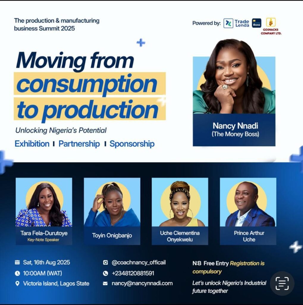 Lagos, Nigeria, In a time when Nigeria’s economic conversation remains largely fixated on policy debates and consumer patterns, a bold counter-narrative is emerging from the entrepreneurial frontlines. On Saturday, August 16th, 2025, industry leader and financial literacy advocate Nancy Nnadi, popularly known as The Money Boss, will host The Production & Manufacturing Business Summit in Victoria Island, Lagos.