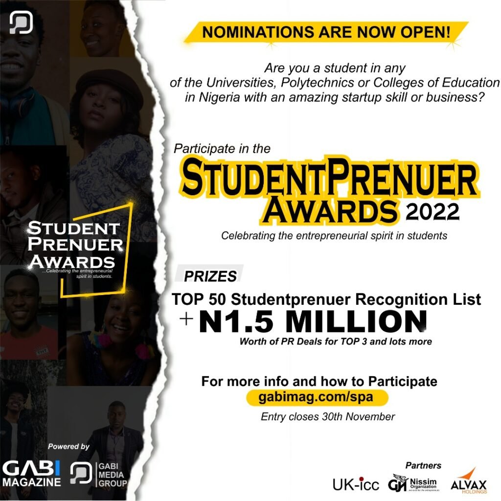 The award is given to students who have demonstrated entrepreneurial and creative skills. The prize includes recognition as one of the TOP 50 STUDENTPRENEUR 2022, a 1.5 MILLION Naira PR Deal, free Business Mentorship For Three Months, Direct Access to GABI MEDIA LLC FOUNDER, Business Networking, and so on